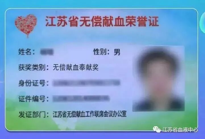 在江苏省内,献血累计满4000毫升,就可获得“江苏省无偿献血荣誉证”(俗称“三免卡”)。