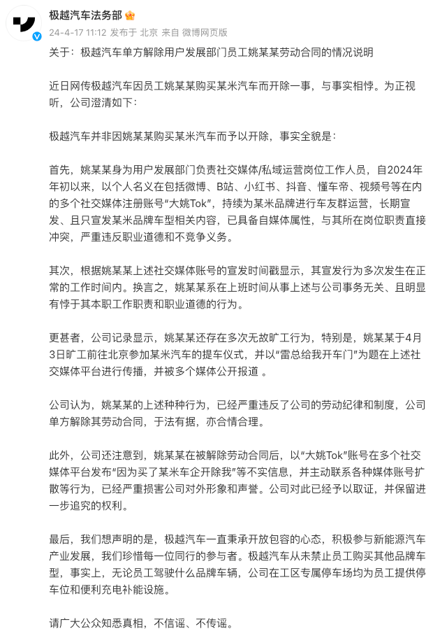 4月17日,针对极越员工买小米汽车被开除的传闻,极越汽车法务部发布声明称,并非因姚某某购买某米汽车而予以开除,而是姚某某系在上班时间从事与公司事务无关、且明显有悖于其本职工作职责和职业道德的行为。公司认为,姚某某的上述种种行为,已经严重违反了公司的劳动纪律和制度,公司单方解除其劳动合同,于法有据,亦合情合理。