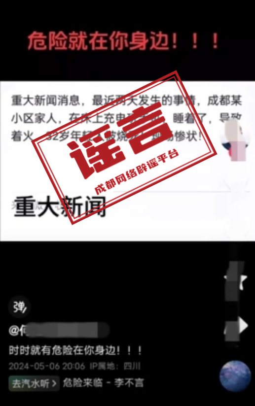 近日,四川遂宁船山公安网安大队查处一起网络谣言。2024年5月6日,违法行为人何某(男,56岁,蓬溪县人)通过抖音平台(其抖音账号关注人数超过1万)发布信息:“重大新闻消息,最近两天发生的事情,成都某小区家人,在床上充电玩手机,睡着了,导致着火,32岁年轻人被烧死!现场惨状”,并配以网络图片。