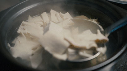 4、沥干水分的豆腐、百叶放入锅中(动作要轻,防止弄碎豆腐),大火煮开后调小火慢炖30分钟,出锅时加入葱白即可。