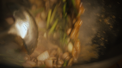 4、锅内放入提前切好的洋葱、蒜苗、大蒜翻炒均匀,随后加入啤酒、蚝油、美极鲜、十三香、酱油等调料,再次翻炒至色泽均匀;