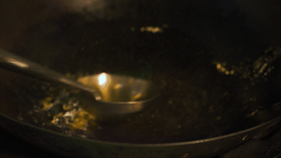 5、生粉勾芡后倒入锅内,再淋入适量麻油,大火收汁后装盘。