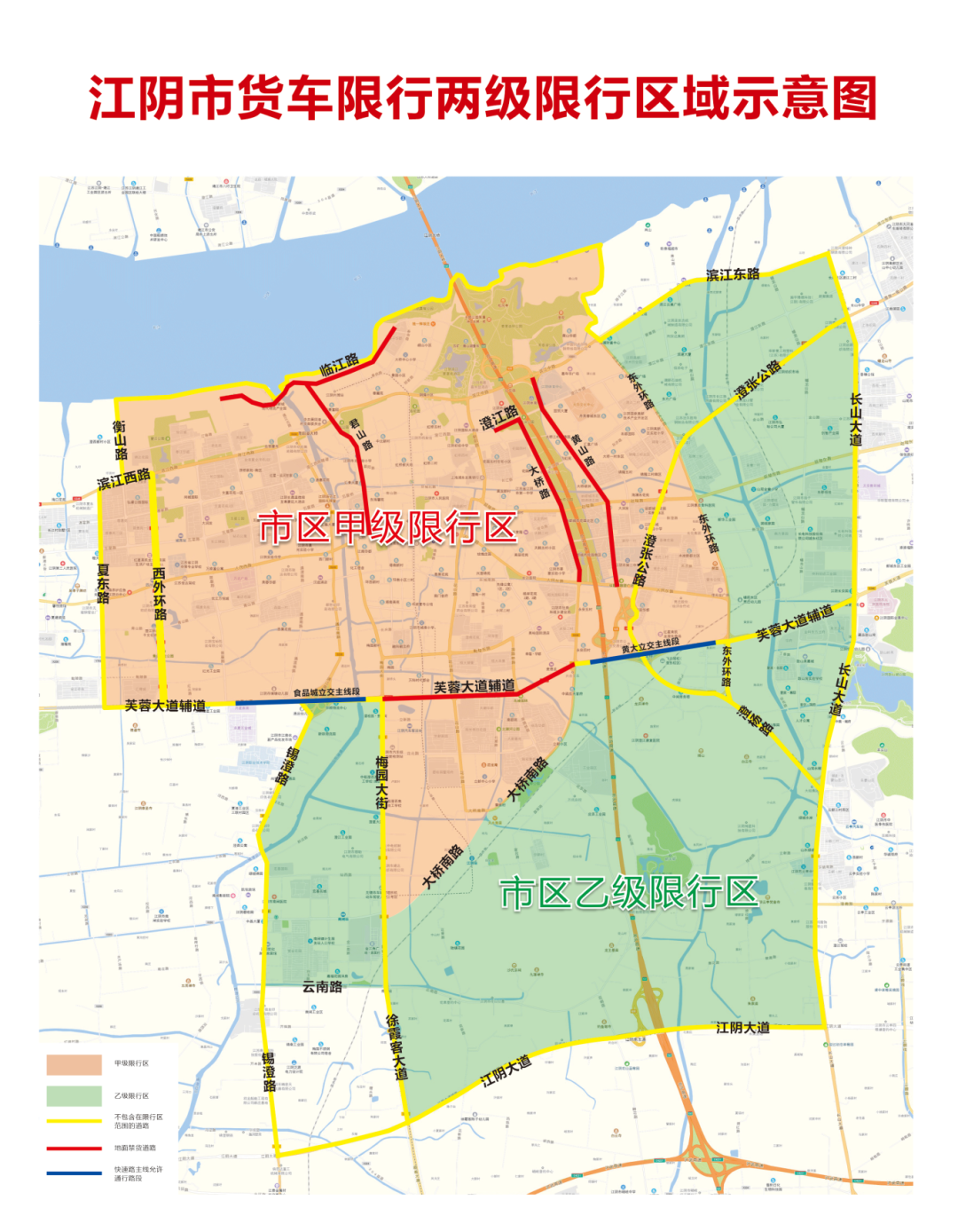 以甲级限行区南沿的梅园大街、大桥南路、芙蓉大道为分界道路,东沿的东外环路为分界道路,以及锡澄路、云南路、徐霞客大道、江阴大道、长山大道、滨江东路等构成的环线以内道路【云南路包含在乙级限行区范围;徐霞客大道、澄杨路、澄张专用公路、东外环路(澄杨路至芙蓉大道)、芙蓉大道快速路食品城立交桥(普惠路东匝道口至梅园路西匝道口主线段)和璜大立交桥(大桥南路东匝道口至东外环路西匝道口主线段)及其它构成环线的道路不包括在内】。