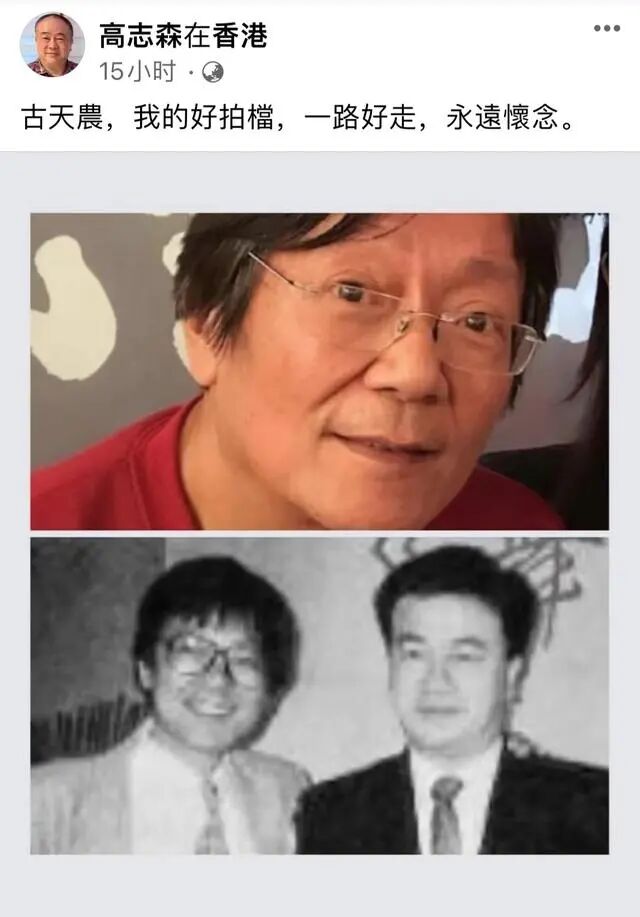 香港知名导演高志森悼念古天农古天农求学时期就对戏剧有浓厚兴趣,1983年加入香港话剧团成为全职演员,1993年成为香港中英剧团首位华人艺术总监。古天农创作了不少脍炙人口的剧作,曾凭借执导《我和春天有个约会》《芳草校园》和《相约星期二》,三度夺得香港舞台剧奖“最佳导演”奖;1994年获得香港戏剧协会十年杰出成就奖。