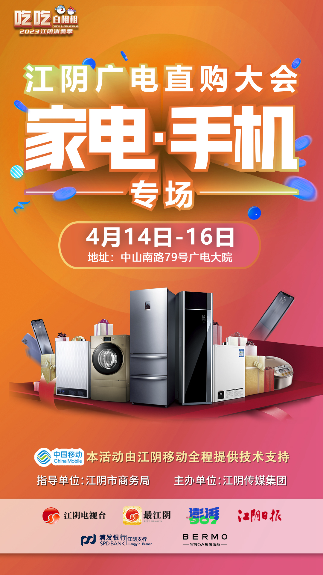 4月14日-16日,2023“吃吃白相相”江阴消费季第三季江阴广电直购大会家电·手机专场,相约中山南路79号广电大院。