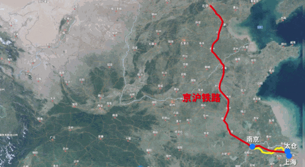 往北经上海枢纽沿京沪铁路可以到达济南、天津、北京。