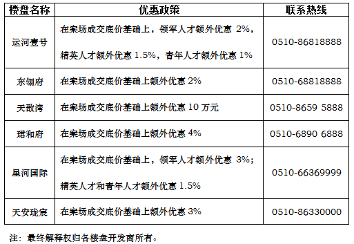 为更好助力人才留澄安居、圆梦置业,人才集团联合我市5大房企共同推出“金九银十·人才安家季”活动。本次活动共有运河壹号、东翎府、天敔湾、珺和府、星河国际、天安数码城等楼盘参加,共推出120套优质房源,优惠政策均为在案场成交底价基础上,总价另行额外优惠1%-4%不等。优惠详情请见各楼盘。