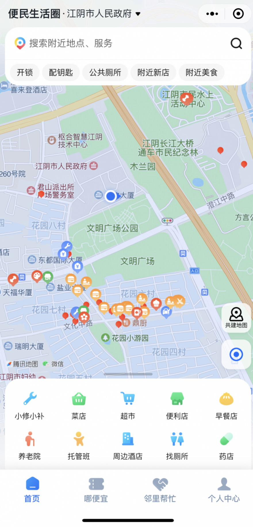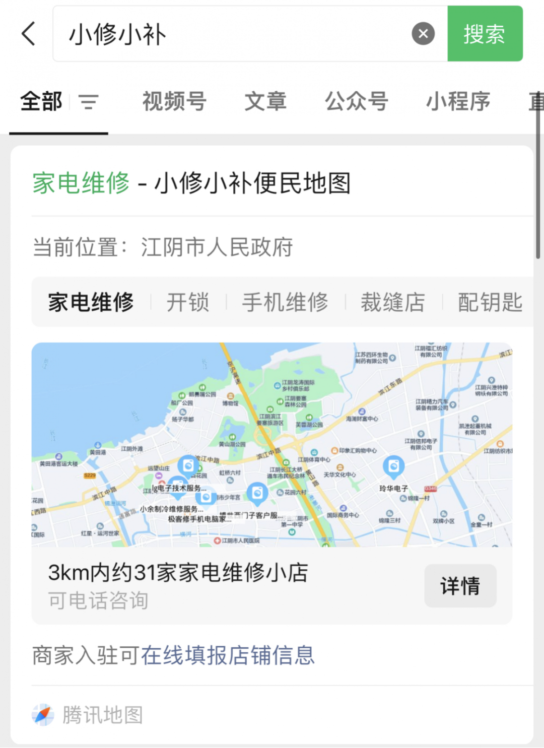 除了“小修小补”,微信与腾讯地图近日升级上线了全国首张“一刻钟便民生活圈地图”,在微信搜一搜或者腾讯地图App搜索“便民生活圈”,就能很方便地查找到附近的超市、便利店、早餐店-----