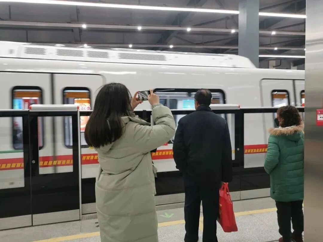 闸机开放,免费通行,6点51分,从南方泉开来的S1列车缓缓驶入堰桥站,热心市民程少武一家人踏上“小白”,并用手机短视频记录下这一难忘时刻。