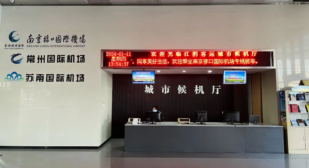 江阴城市候机厅位于江阴汽车客运站内,该候机厅获得了东部机场集团有限公司授权,于1月19日新增南京禄口国际机场专线,可为江阴及周边地区前往南京禄口国际机场的旅客提供购票、值机、航班信息查询、行李托运、候车及机场大巴接送等一站式畅行服务,让旅客享受无缝接驳的出行体验。