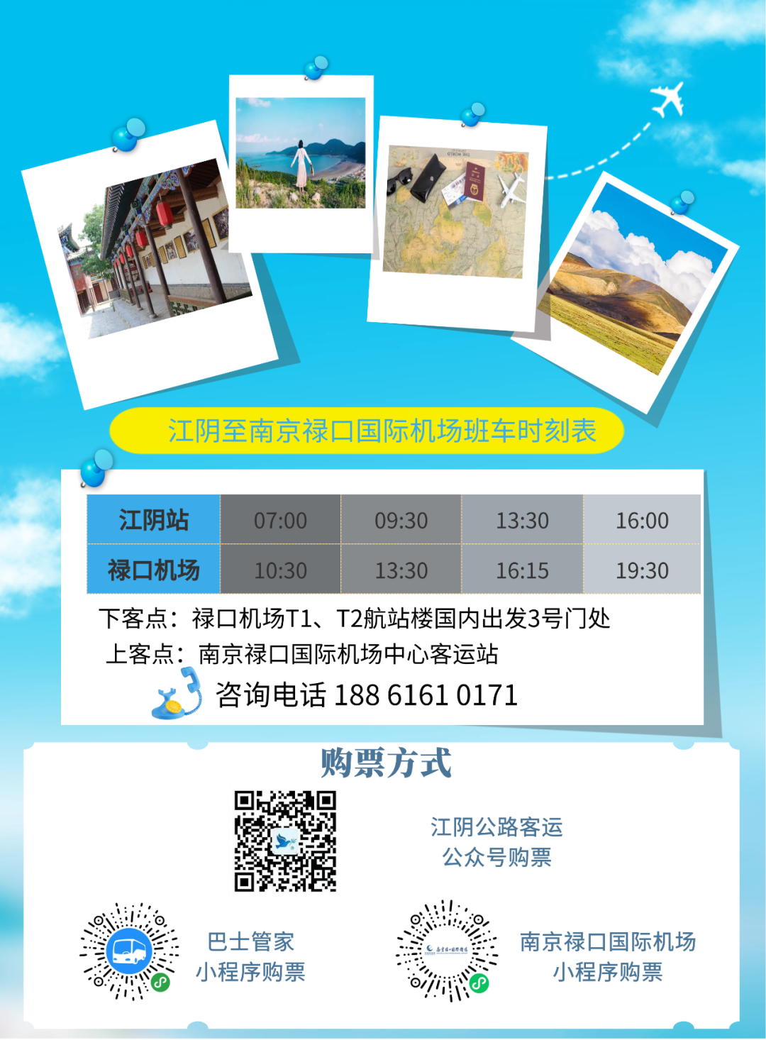 专线直达目前,南京禄口国际机场专线共开行4趟班车,中途不停站,约1小时50分钟即可由江阴直达南京禄口国际机场,出行旅客可通过江阴公路客运微信公众号、南京禄口国际机场微信小程序、巴士管家微信小程序等方式购买机场专线车票。