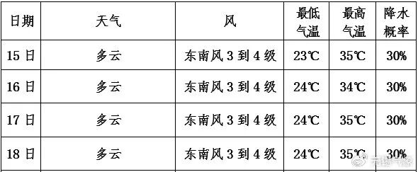 全省偏东风4到5级,有雷雨地区雷雨时短时阵风7到9级。