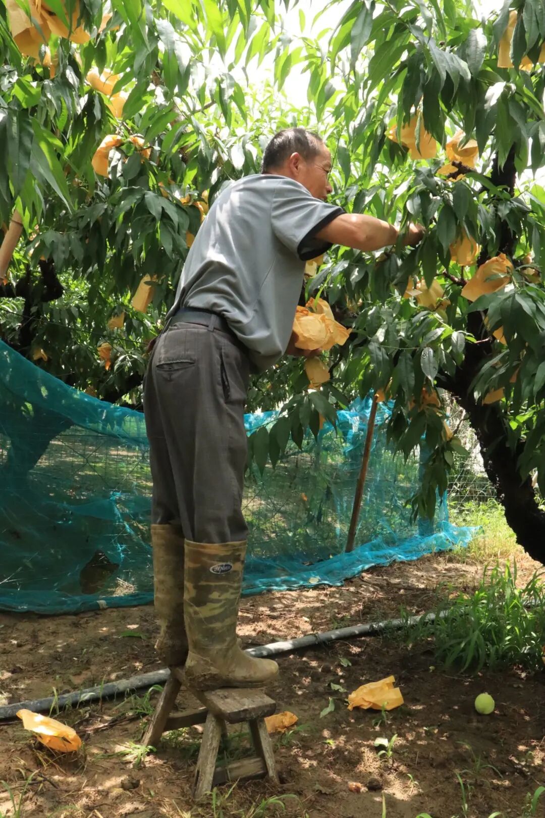 四月,桃花盛开过后,他们便开始忙碌的剪枝、筛桃、包桃工作,一直持续到五六月份。每天清晨4点左右,一家人就进入桃园开始一天的工作,直到晚上8点才出桃园。几亩桃园的背后,是大多数人都不曾熬过的苦。儿子因工伤行动不便,却也从未落入落下田间的活。