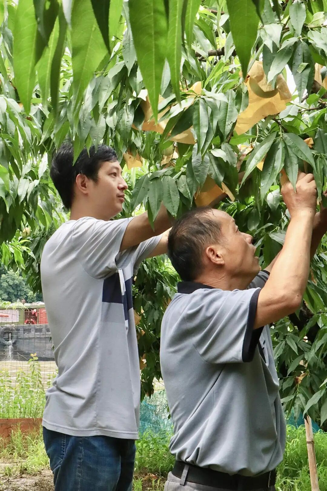 前几天梅雨里,气温不高湿度极大,小编走进桃园差点闷死在里头;这两天好了,气温极度上升,正常人谁能忍受这样的高温下在桃园里一呆就是一整天!老樊一家三口,可舍不得多请人工,全家拼了命在这桃园里辛苦劳作,就为了这一年一回的收成……