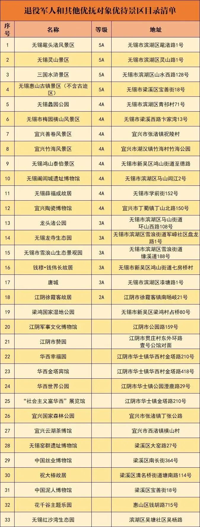 优待对象凭“中华人民共和国退役军人优待证”“中华人民共和国烈士、因公牺牲军人、病故军人遗属优待证”,在无锡市行政区域内免费乘坐公交(不含定制公交)、地铁;免费参观游览国有博物馆、纪念馆、美术馆等公共文化设施和实行政府定价或指导价管理的公园、展览馆、名胜古迹、景区(见附件1),园中园、园内收费及夜游项目除外。