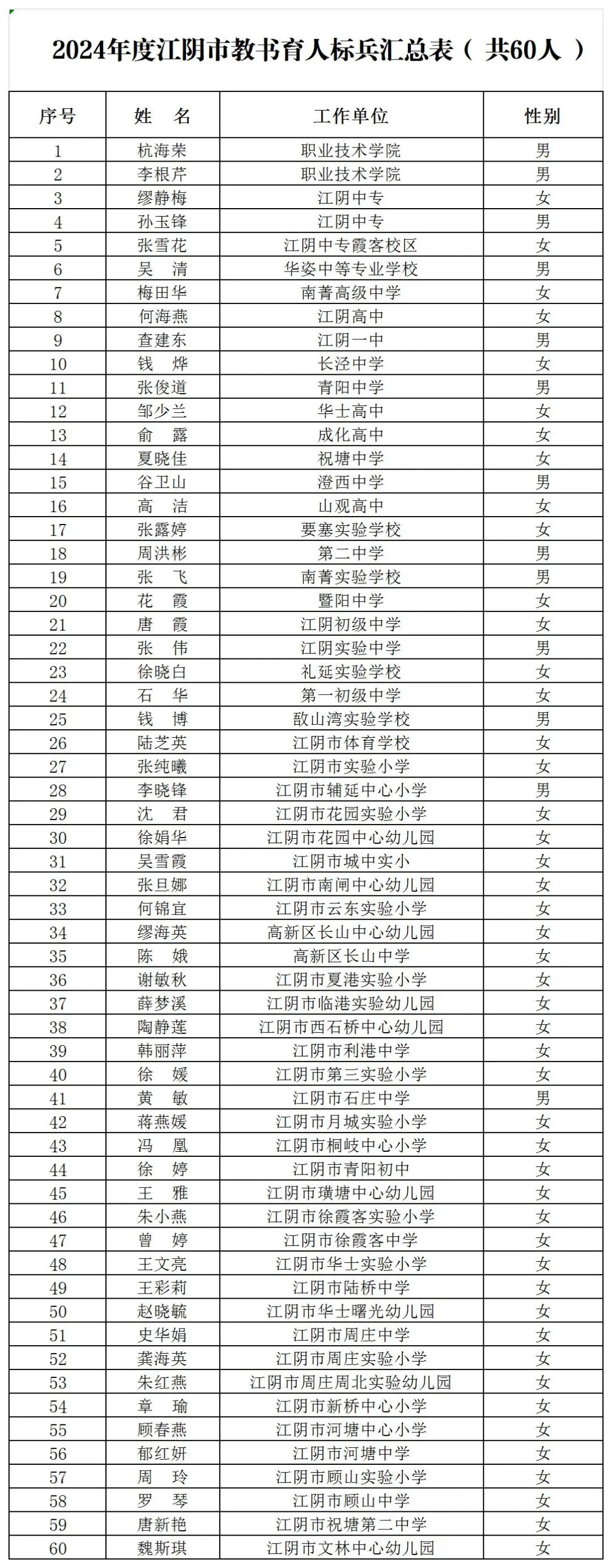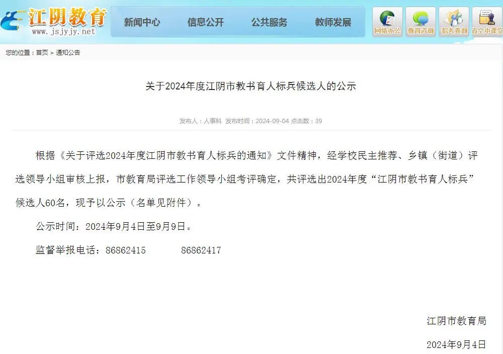 根据《关于评选2024年度江阴市教书育人标兵的通知》文件精神,经学校民主推荐、乡镇(街道)评选领导小组审核上报,市教育局评选工作领导小组考评确定,共评选出2024年度“江阴市教书育人标兵”候选人60名,现予以公示(名单见附件)。
