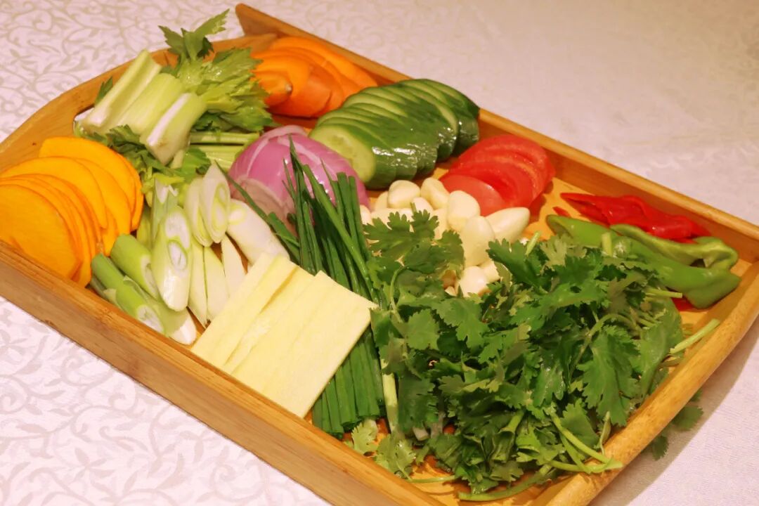 浅金色的汤,浅粉色的手打青虾丸子,六七斤重的大花鲢鱼头沉卧在汤底,煞是好看。这锅汤的精妙之处就在这一盆蔬菜,10多种蔬菜让这锅汤与众不同。