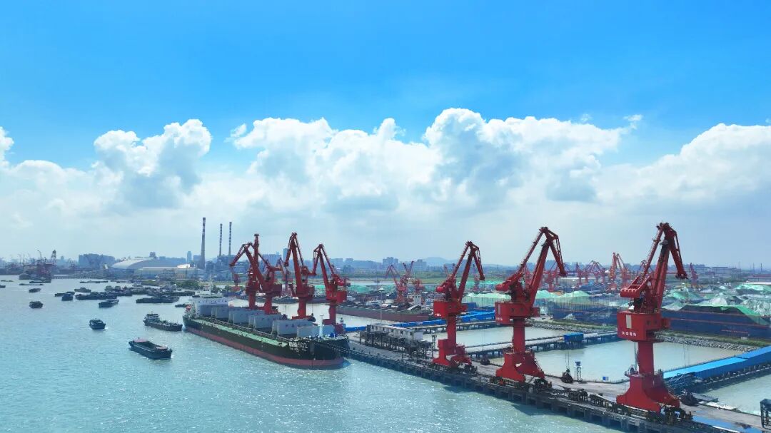 一艘艘货船穿梭于碧波荡漾的江面,码头工人们忙碌的身影映射出热火朝天的干劲。