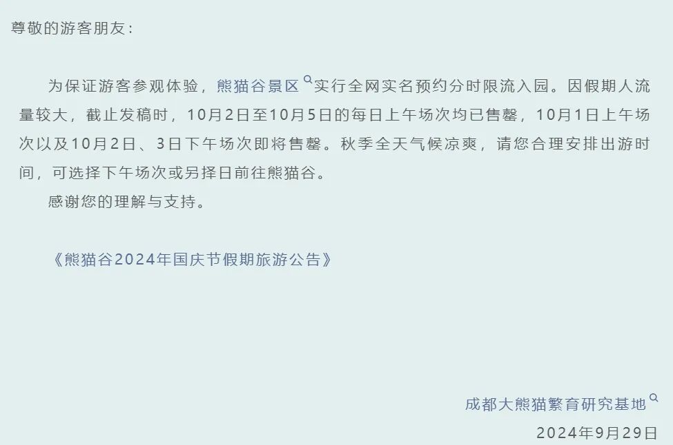 成都熊猫谷景区也在29日发布公告称,10月2日~10月5日的每日上午场次均已售罄,10月1日上午场次以及10月2日、3日下午场次即将售罄。