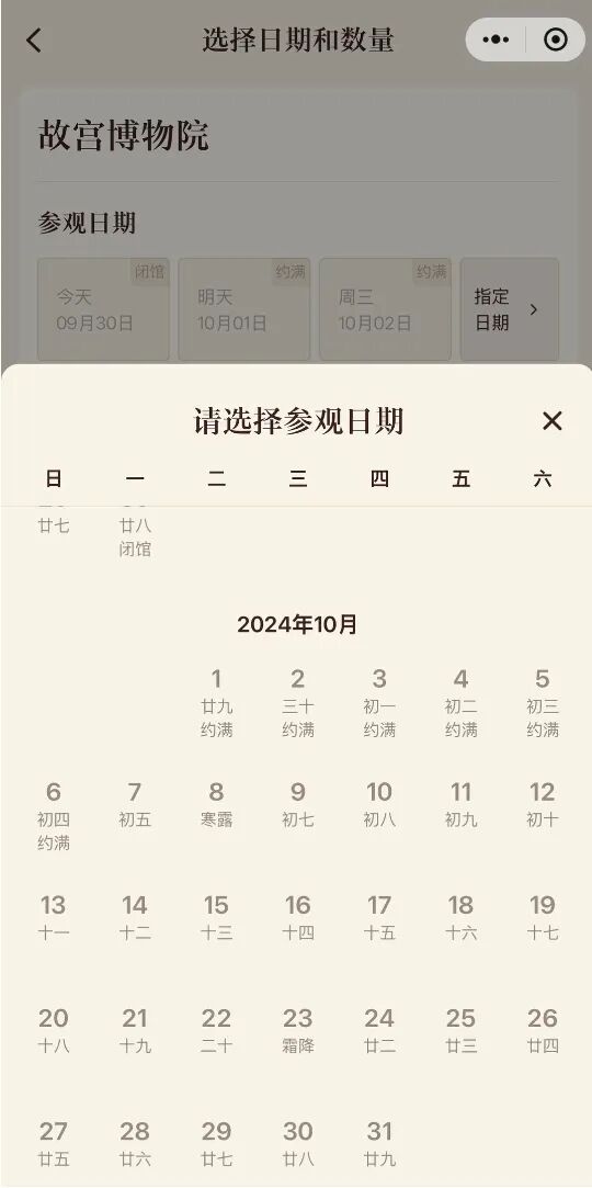故宫博物院故宫博物院小程序显示,10月1日至6日参观预约已约满。
