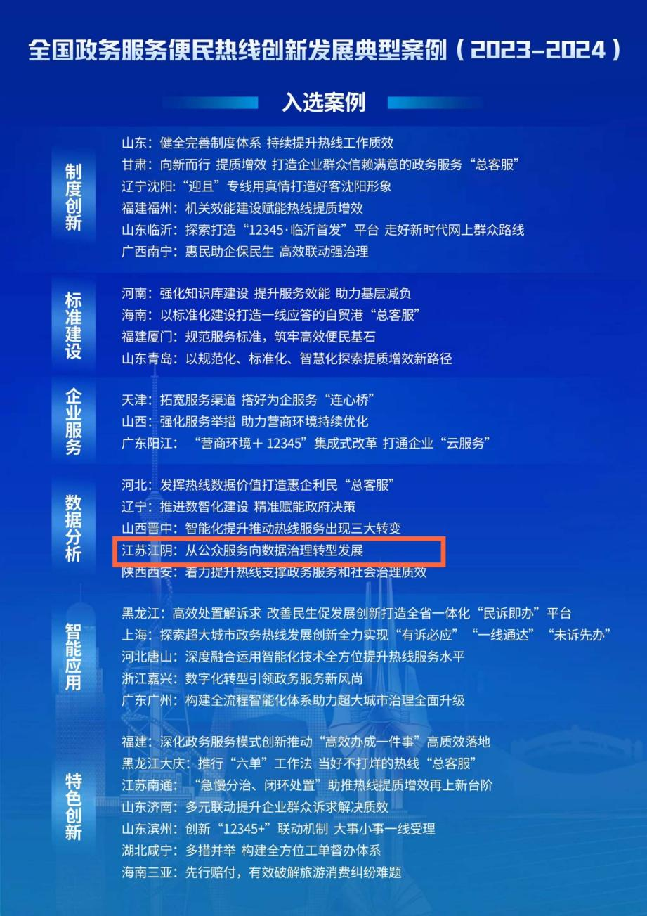 近日,全国政务服务便民热线创新发展暨标准化工作推进会议在山东省临沂市举行。会上,《全国政务服务便民热线创新发展典型案例(2023-2024)》正式对外发布。江阴市《从公众服务向数据治理转型发展》案例成功入选。
