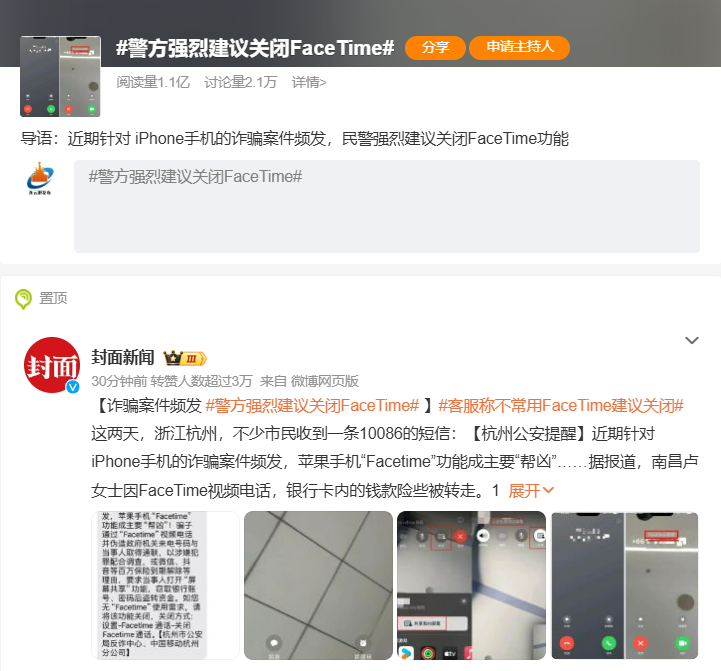 需要提醒的是,任何官方平台,包括公检法机关,绝不会通过FaceTime来电开展工作,如自称是“公检法”或网贷、电商等平台跟您联系,应及时通过官方渠道与相关部门核实,请勿轻信陌生来电。