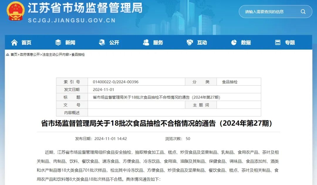 11月1日,江苏省市场监督管理局发布最新通告,在近期组织食品安全抽检的18大类食品701批次样品中,检出8大类食品18批次样品不合格。