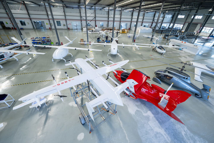 踏入牧羽航空科技(江苏)有限公司展馆,既有载重8吨的电动垂起固定翼eVTOL(电动垂直起降飞行器),也有水陆两栖的折叠翼飞机,10多种型号琳琅满目。公司负责人王勇说:“我们致力于重载eVTOL的研发和生产,可以适用于海岛或远距离物流运输。”