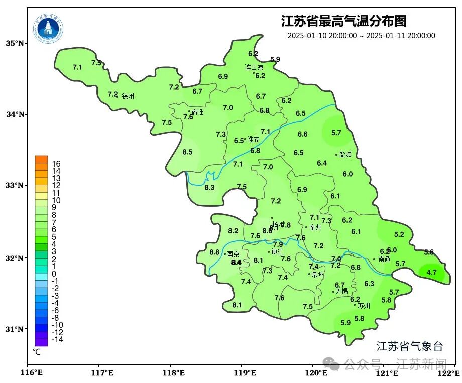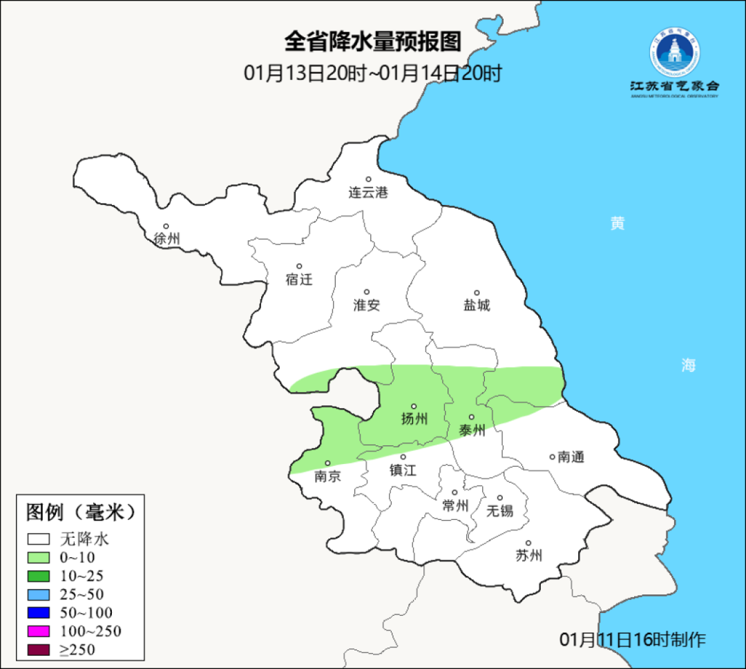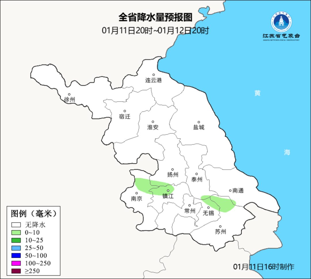 据江苏气象最新预报,1月11日20时至1月12日20时夜里全省阴,其中沿江局部地区有零星小雨或小雨夹雪,12日白天全省多云到晴。