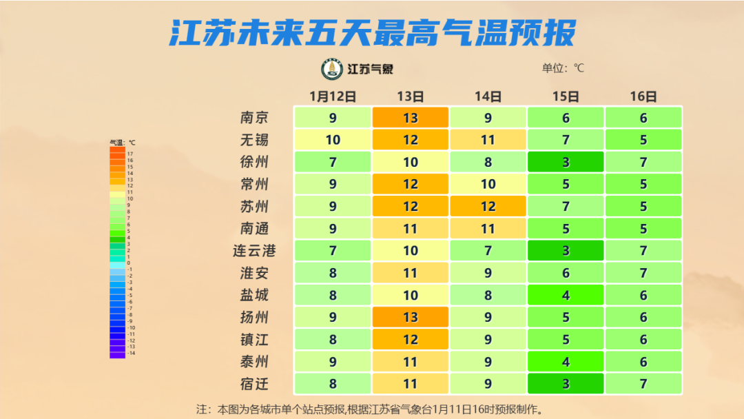 1月13日20时至1月14日20时:全省多云转阴,其中14日白天江淮之间部分地区有时有小雨。最高温度本省东南部地区11~12℃,其他地区8~9℃;最低温度沿江和苏南地区1~2℃,其他地区-1~-2℃。全省偏西风3-4级转偏北风4-5级。