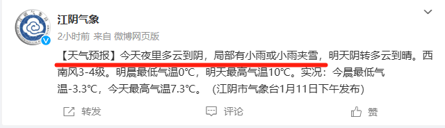 刚刚@江阴气象发布天气预报,今天夜里多云到阴局部有小雨或小雨夹雪,明天阴转多云到晴。