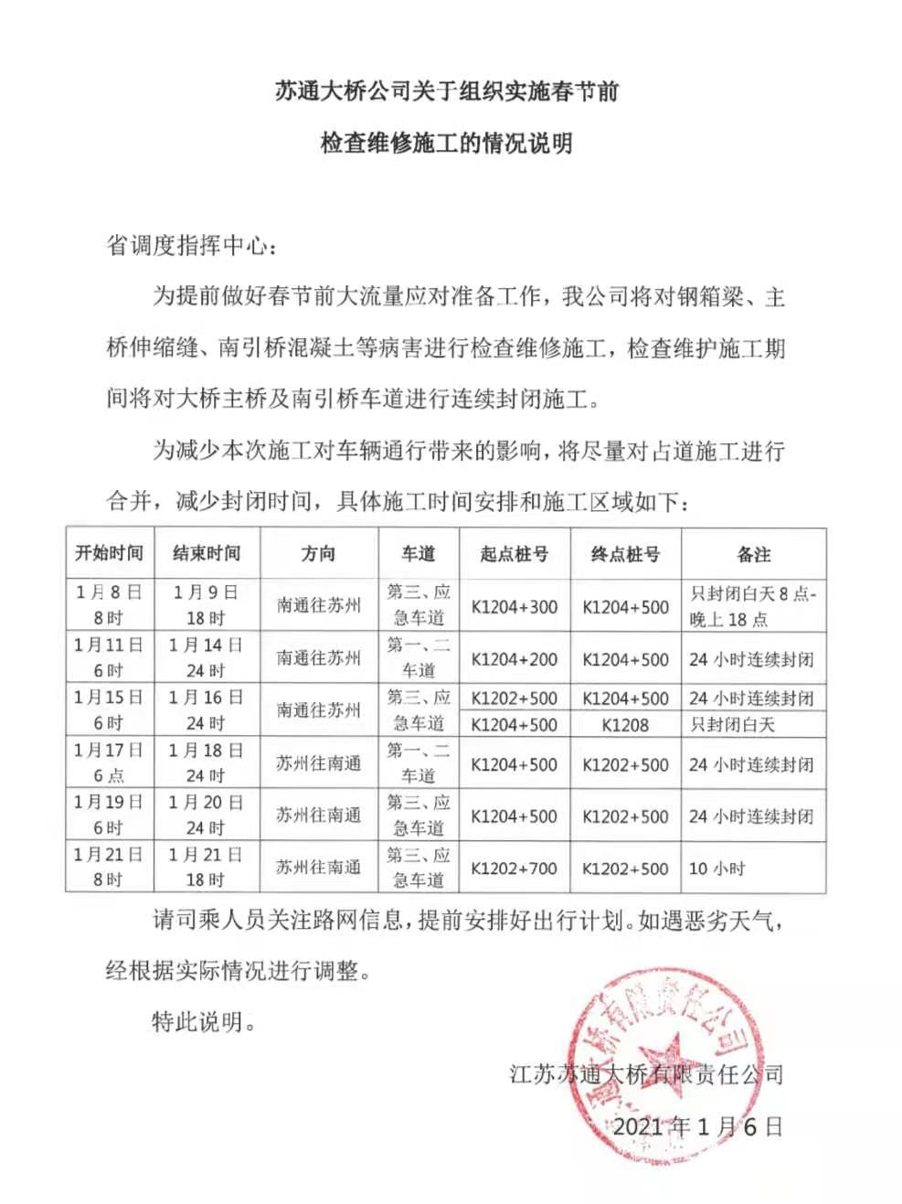 为全力做好2021年春运工作,苏通大桥公司将于2021年1月8日至1月21日对大桥进行集中养护施工。期间,分方向封闭部分行车道,将对交通出行造成较大影响。请有条件的驾驶人选择从沪苏通大桥、通常汽渡、海太汽渡等过江通道出行。