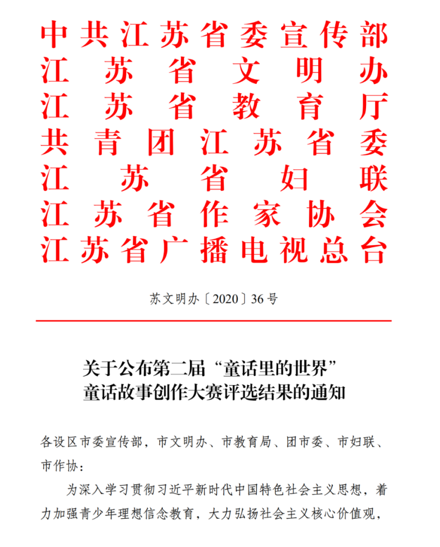 本届童话故事创作大赛以“小康中国 大爱天地”为主题,由中共江苏省委宣传部、江苏省文明办、江苏省教育厅、共青团江苏省委、江苏省妇联、江苏省作家协会、江苏省广播电视总台联合主办,江苏教育报刊总社、张家港市人民政府承办。