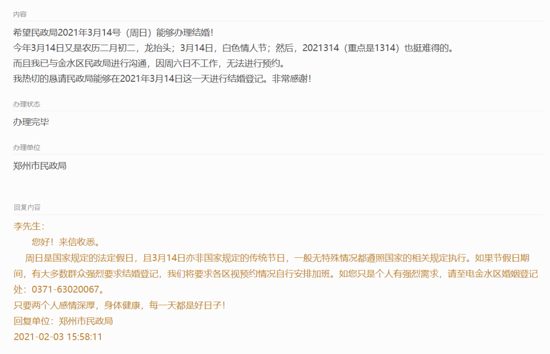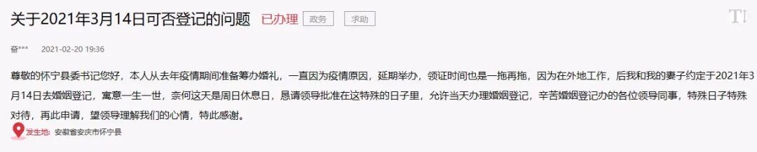 这位网友说希望民政局能在3月14日(周日)临时开门为大家办手续,实现新人们在好日子结婚领证的美好心愿。