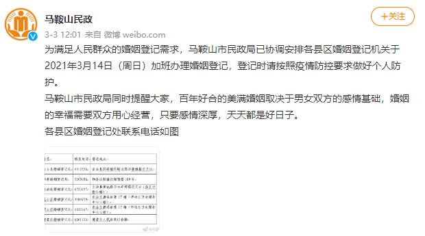 不过也有例外的,3日中午,安徽马鞍山市民政局宣布3月14日加班办理婚姻登记。