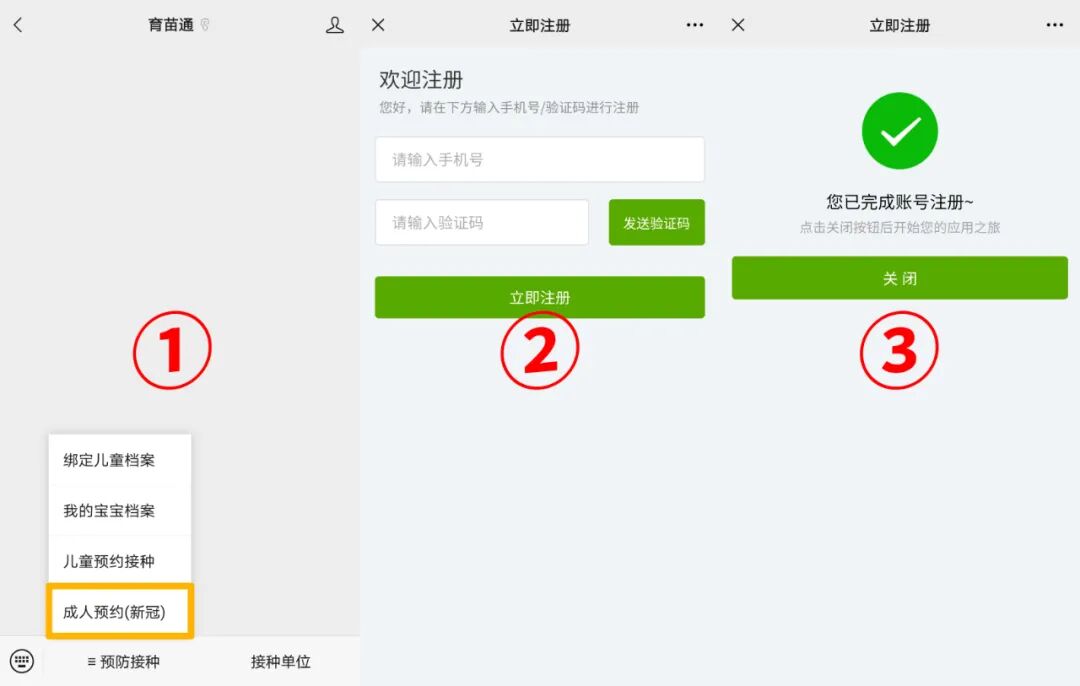进入“育苗通”微信公众号在下拉菜单“预防接种”中选择“成人预约(新冠)”功能完成账号注册