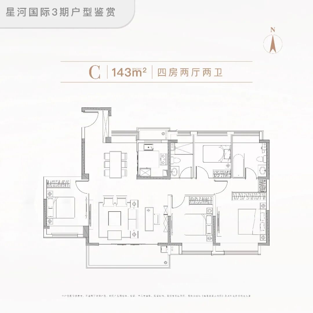 户型面积约143㎡,四房两厅两卫。