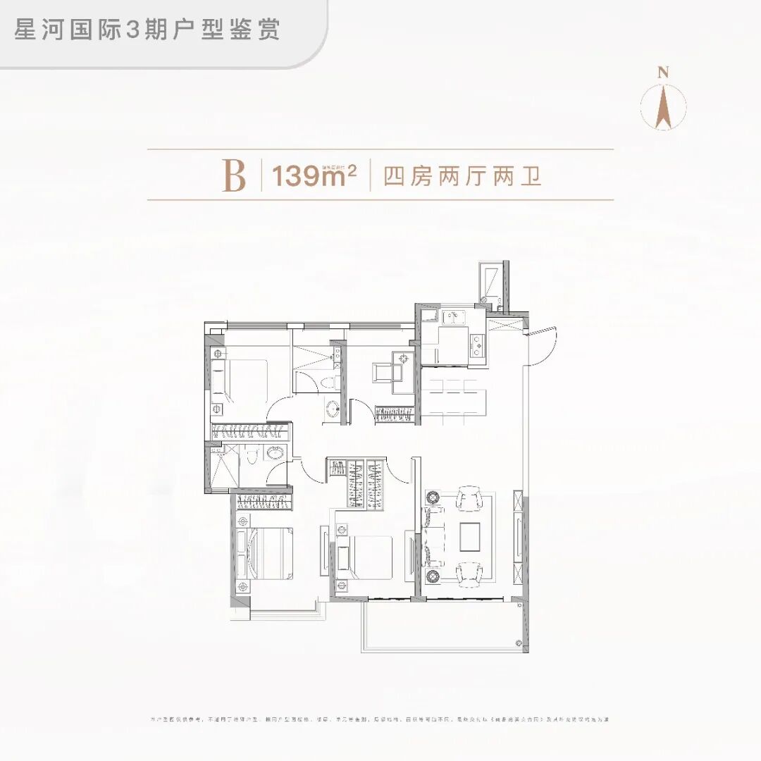 户型面积约139㎡,四房两厅两卫。