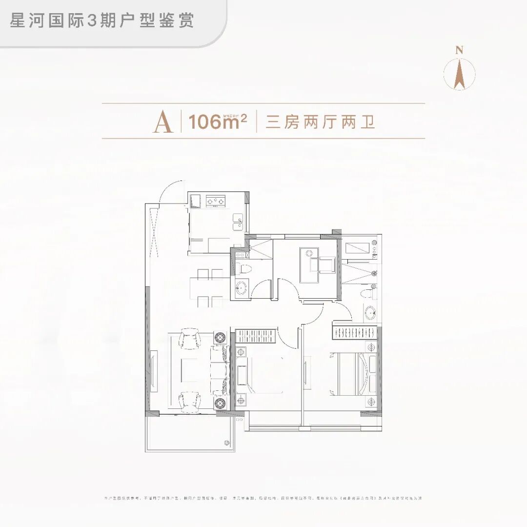 户型面积约106㎡,三房两厅两卫。