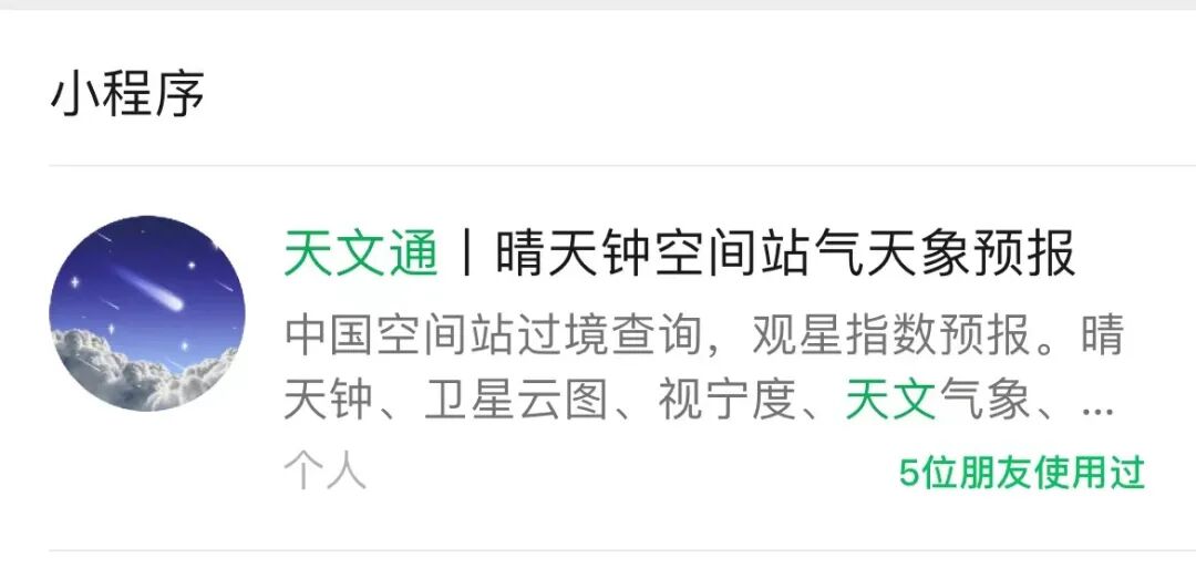在微信搜索并进入“天文通”小程序,点开“快捷入口:中国空间站过境”。