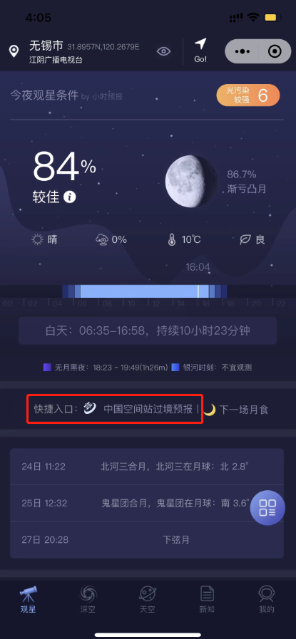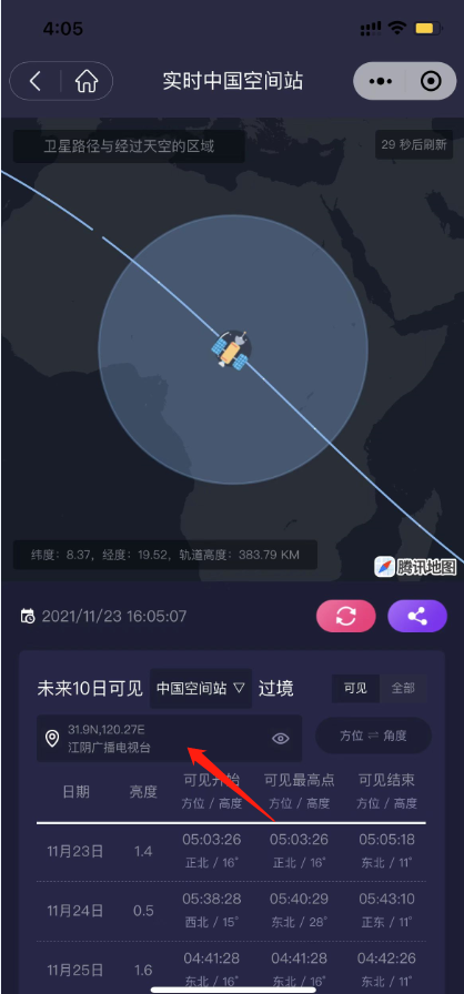 进去后,即可看到中国空间站过境信息,还可以选择自己的位置,显示内容会更加准确。