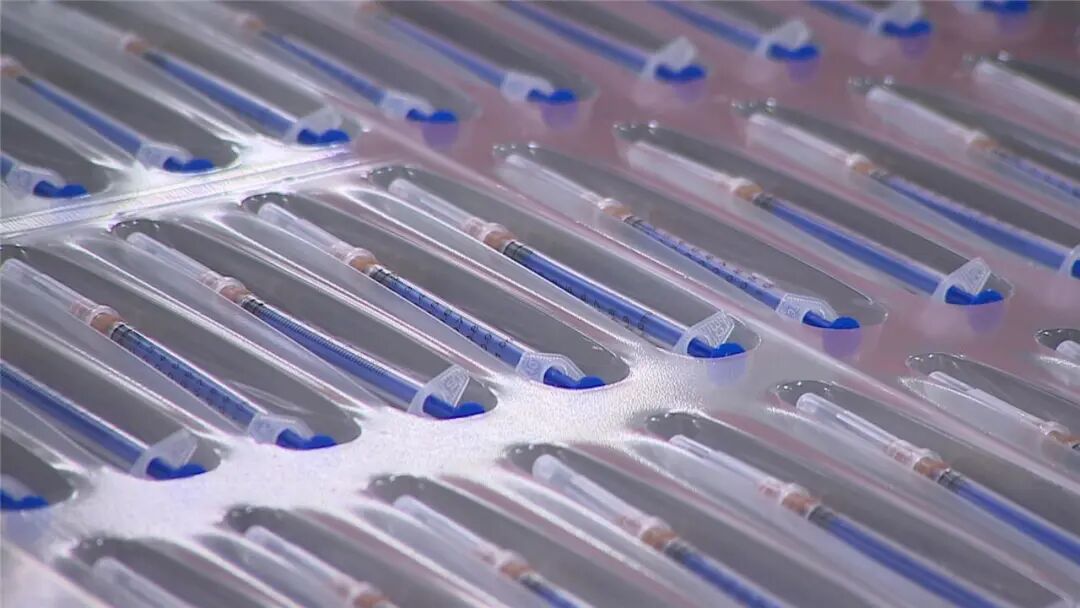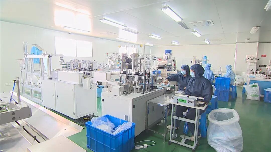 在江阴市医疗器械有限公司的生产车间内,多条自动化生产线满负荷运转,工人们正紧张有序地赶制各类医用口罩和新冠肺炎疫苗注射器等物资订单,生产场景热火朝天。
