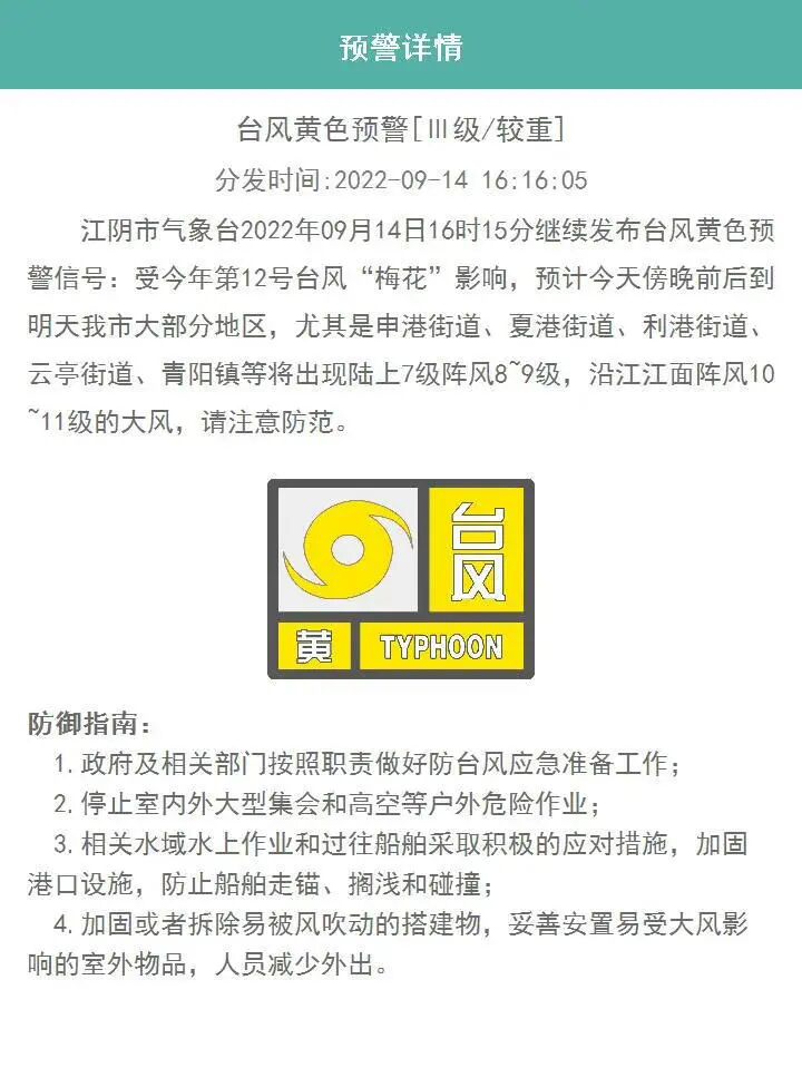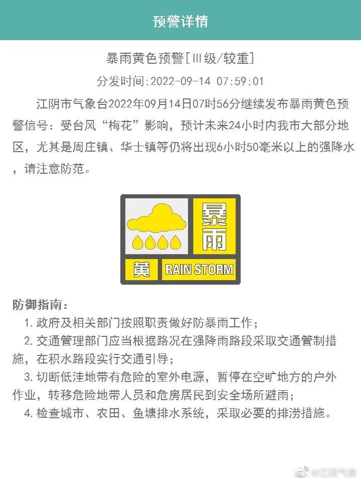 目前,江阴“双黄”预警高挂,暴雨黄色预警信号、台风黄色预警信号。