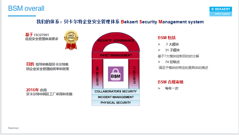贝卡尔特还分享了企业商业秘密保护的重要工具——贝卡尔特企业安全管理体系 (BSM),涉及企业安全管理、人力资源安全、资产管理、物理安全、合作方安全、企业安全事件管理及信息技术安全等7个方面。公司严格按照BSM要求对中国区各工厂做年度合规审计,就如何进行高效的商业秘密保护,给参会企业打开了新的思路。