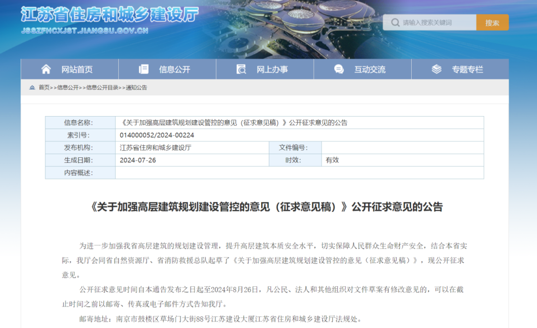 近日,江苏省住建厅会同省自然资源厅、省消防救援总队起草了《关于加强高层建筑规划建设管控的意见(征求意见稿)》(以下简称意见征求意见稿),正公开征求意见。