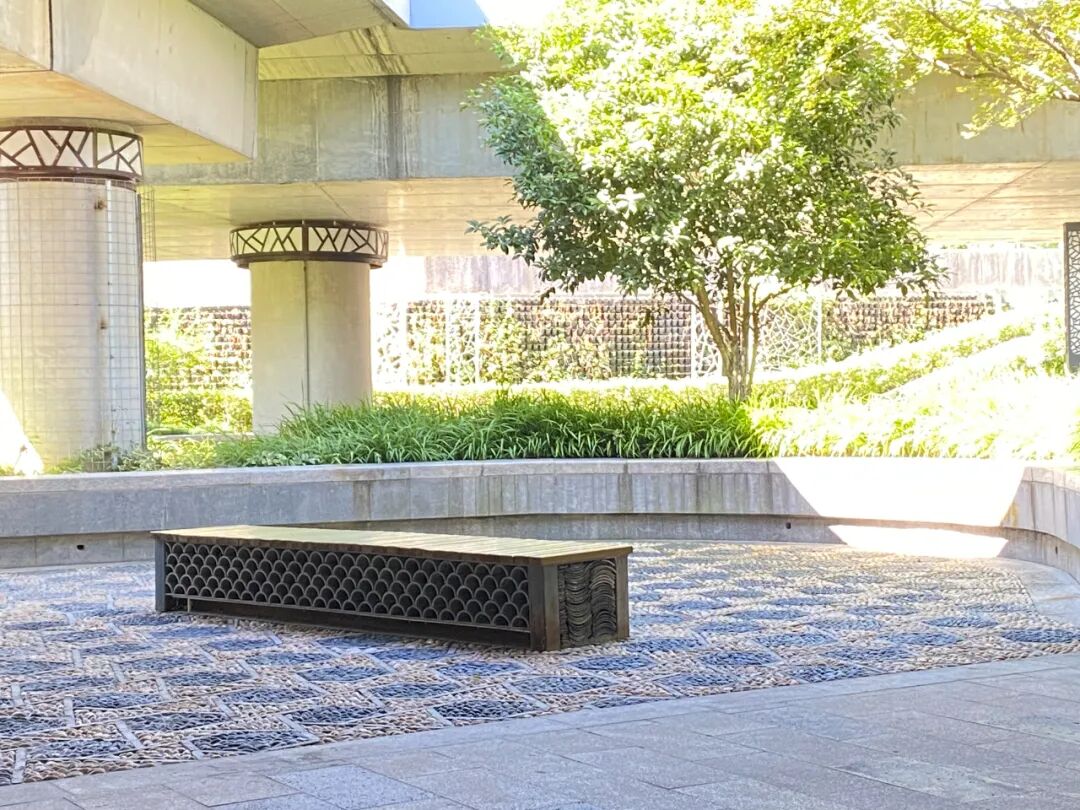 八字桥公园因公园中端明桥和高明桥两桥组合形似八字而得名,公园整体风格以传统中式为主,座椅采用了与公园整体风格相似的传统石材座椅,既古朴美观又具有一定的实用性。