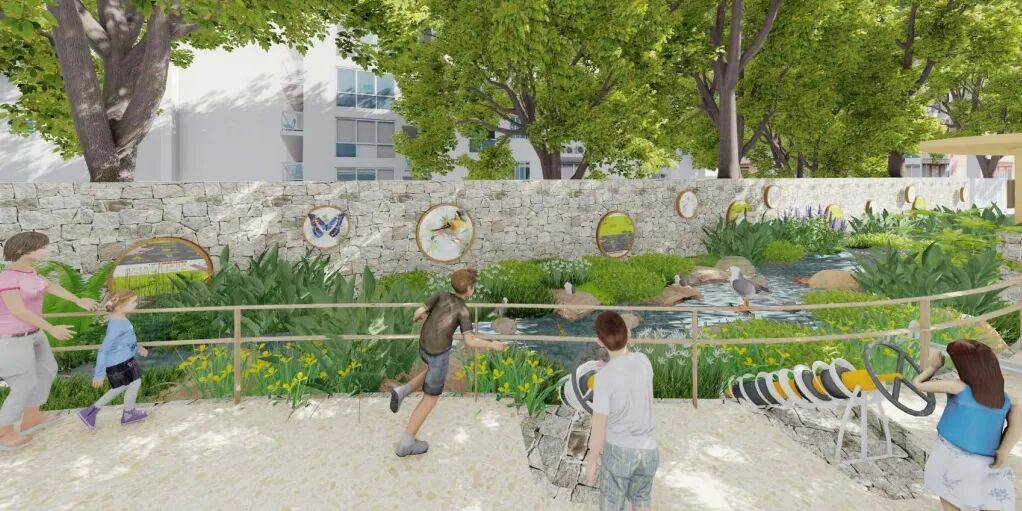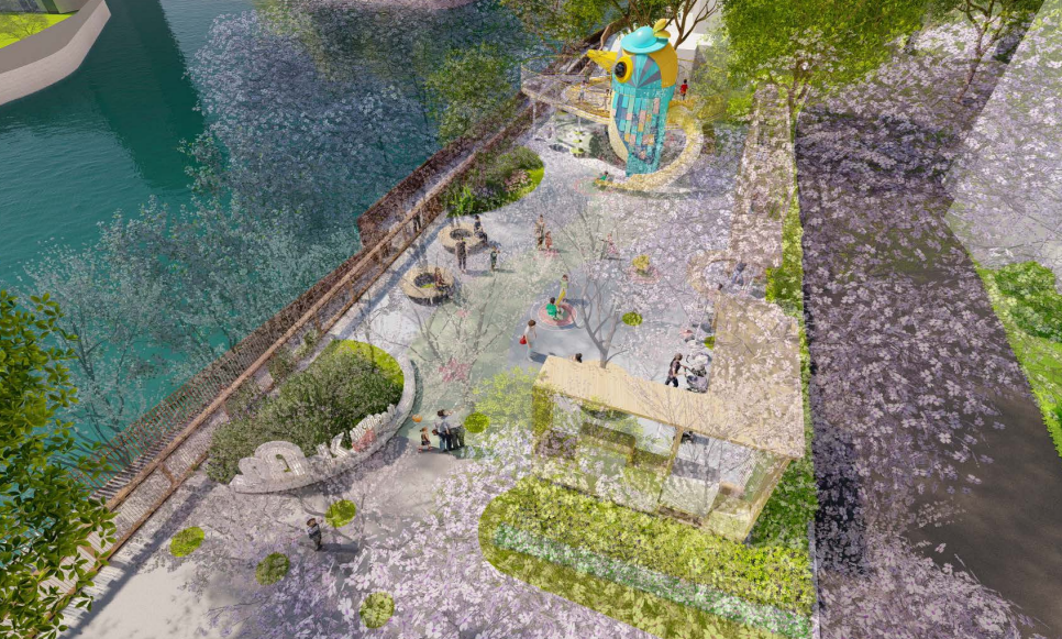 儿童友好的理念贯穿在各个景观节点建设中。靠近桥下运动空间的“雨石花间”区域,增设科普主题驿站,还配有儿童室内生态多媒体展陈空间。同时,结合场地现有条件,打造三级雨水花园,通过科普标识展现雨水的生态循环。
