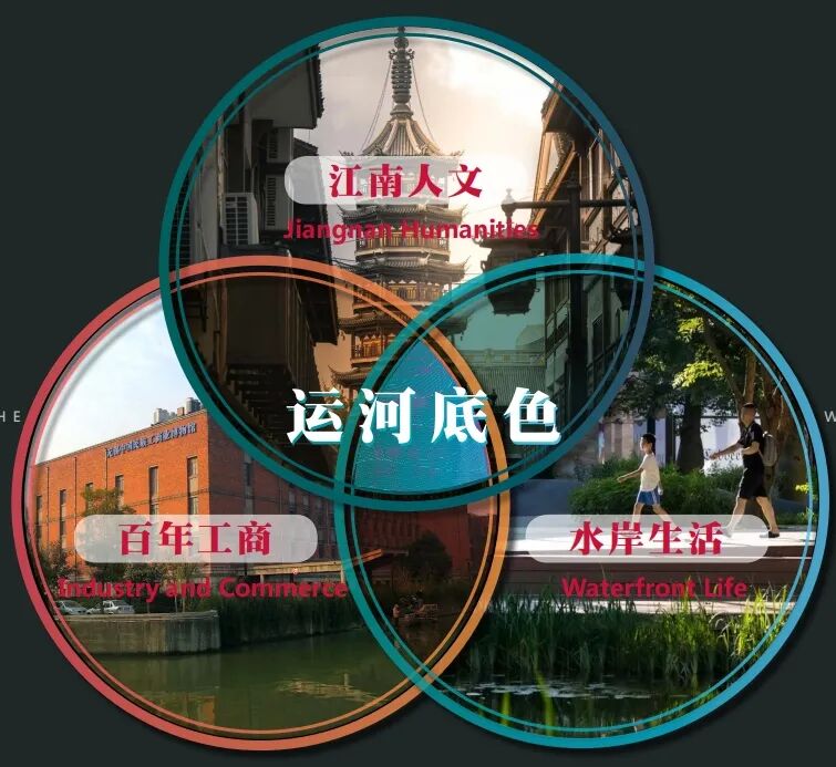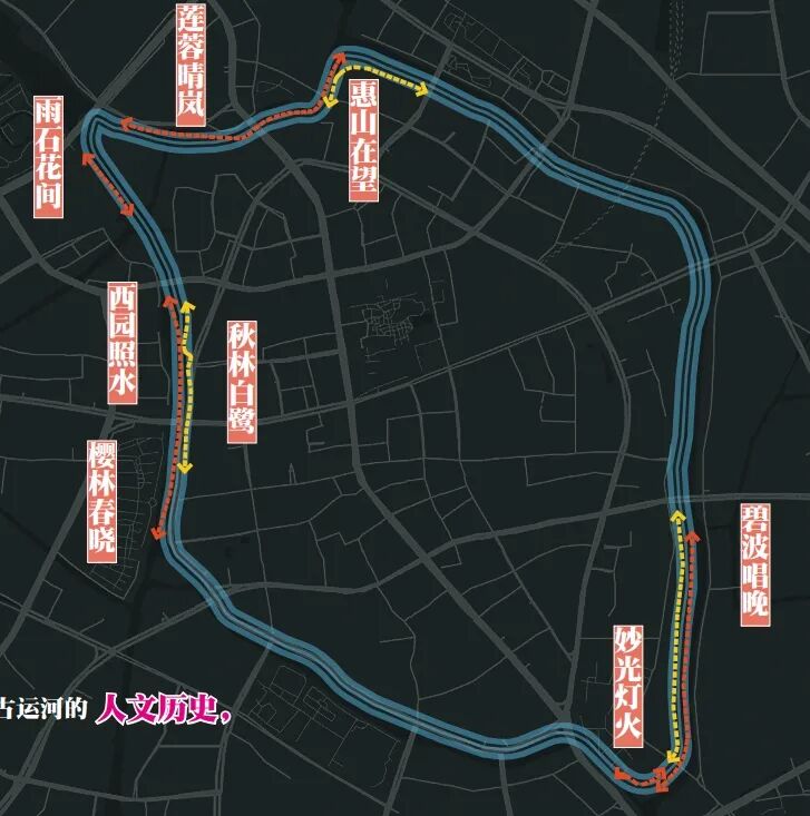 “一河”,即慢行系统的主线古运河水脉,“两廊”则是结合环城古运河多处桥梁的特点,设置上层休闲步廊和下层亲水步廊。从南长街的“碧波唱晚”“妙光灯火”开始,到人民中路附近的“樱林春晓”“西园照水”“秋林白鹭”、北大街附近的“雨石花间”“莲蓉晴岚”,再到历史古迹集聚的“惠山在望”,通过“环城八景”讲出古运河人文历史,打造立体的线性微花园,进一步擦亮“江南水弄堂·运河绝版地”城市名片。