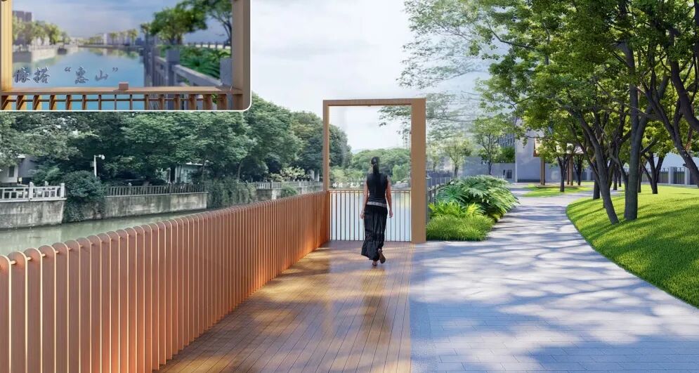 “惠山在望”景观节点靠近通汇桥附近的区域,设计了廊道、亭子、镂空窗,人们在游览过程中可以不经意间发现惠山。