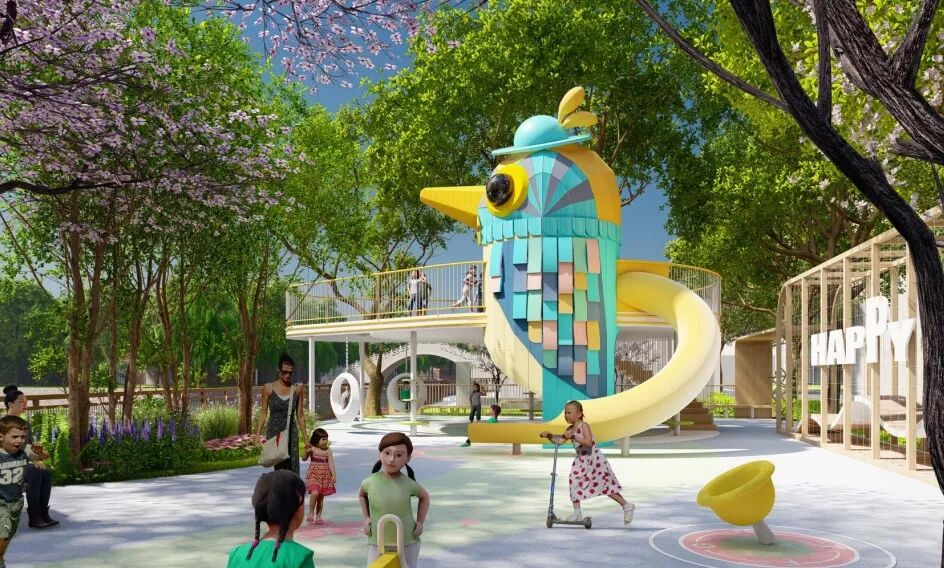 “樱林春晓”景观节点设置儿童乐园和亲子驿站,“莲蓉晴岚”景观节点则是利用4米的高差设置儿童攀爬、滑梯、摇摇马及旋转车等设施。